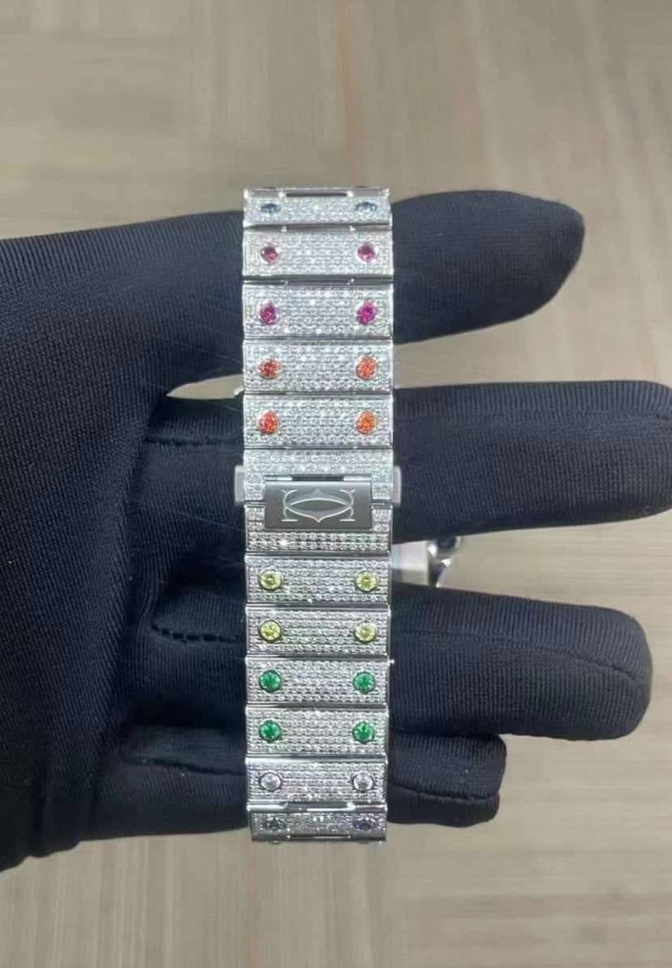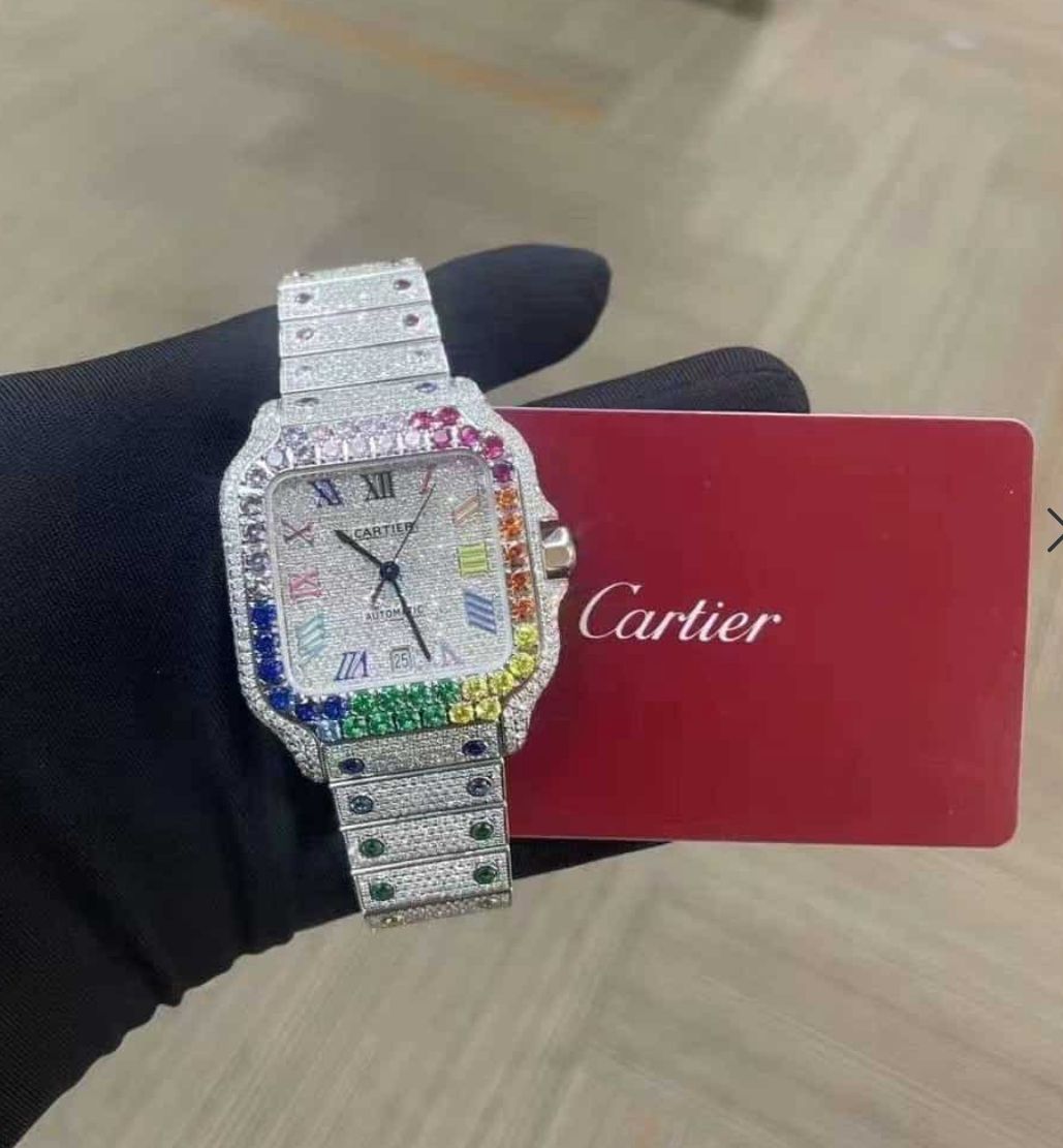 Ervaar luxe en vakmanschap met deze Cartier Santos WSSA0018 Rainbow, volledig bezet met schitterende diamanten en gekleurde edelstenen die de iconische kast omlijsten. Elk detail, van de regenboogkleurige Romeinse cijfers tot de diamanten band, straalt elegantie en exclusiviteit uit.
