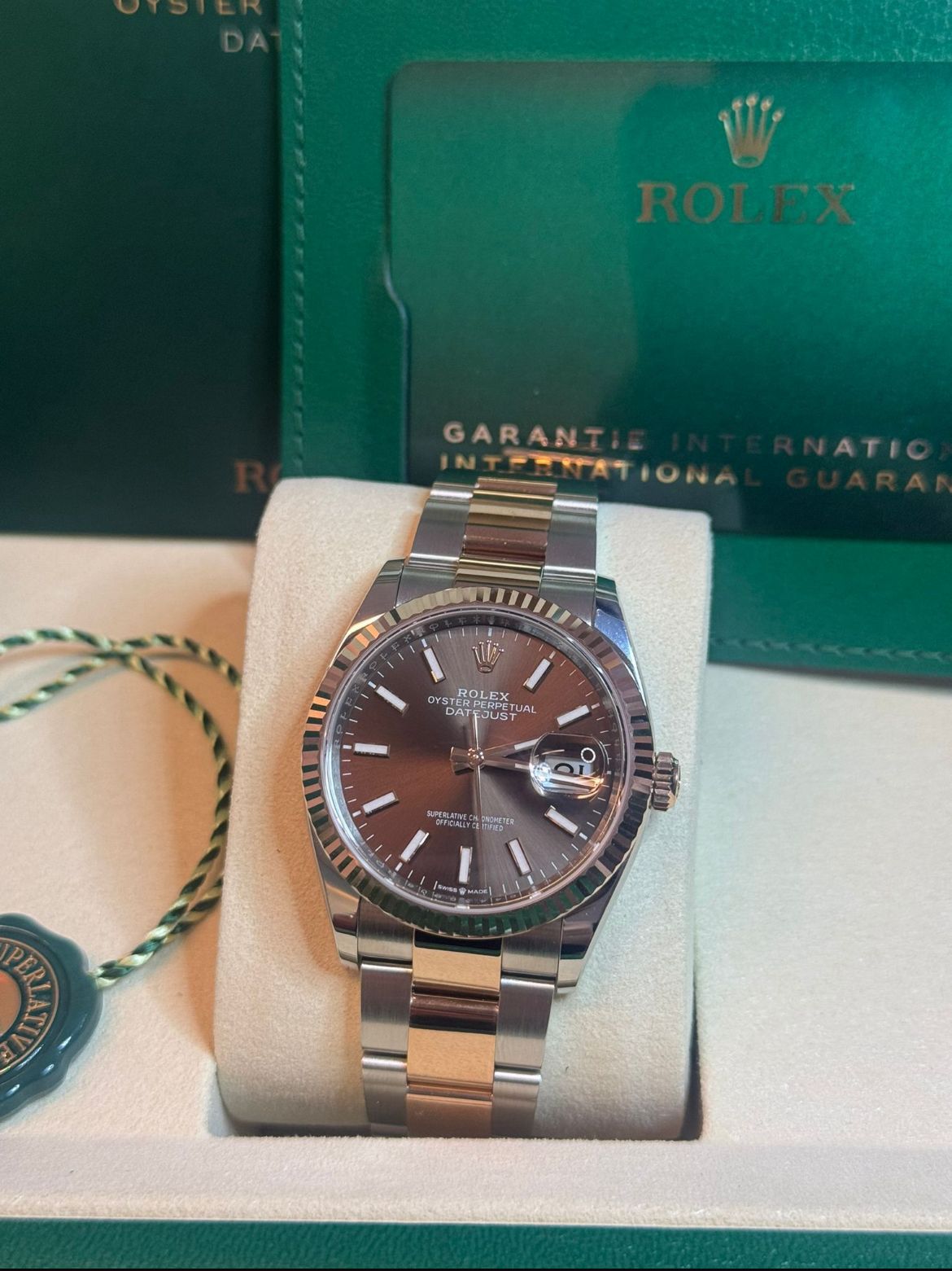 De Rolex Datejust 36 Ref. 126231 in Everose-goud & staal met een chocolate dial is een stijlvol icoon dat klassieke elegantie combineert met moderne klasse. De warme wijzerplaat in combinatie met roségoud geeft dit horloge een unieke uitstraling die luxe uitstraalt zonder te overdrijven.