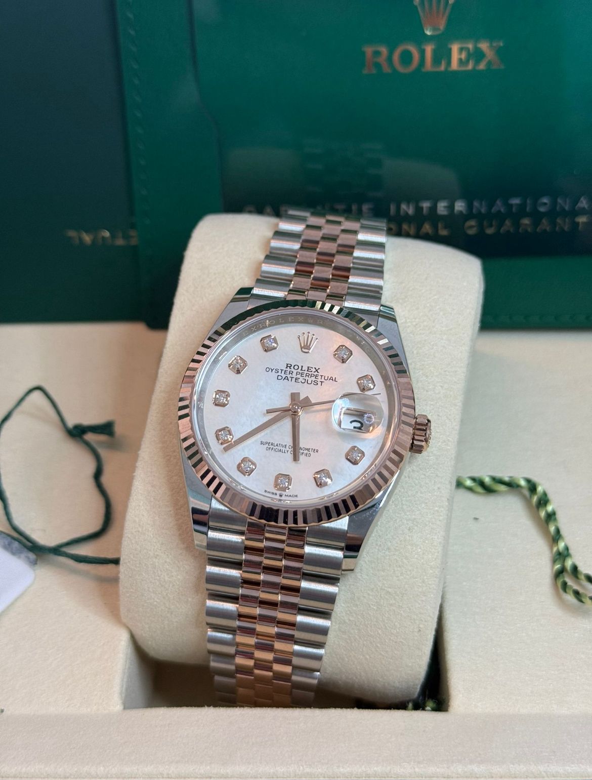 De witte parelmoer wijzerplaat geeft elk horloge een unieke look. In combinatie met diamanten indexen en een Jubilee-band, straalt deze Datejust vrouwelijke elegantie uit.