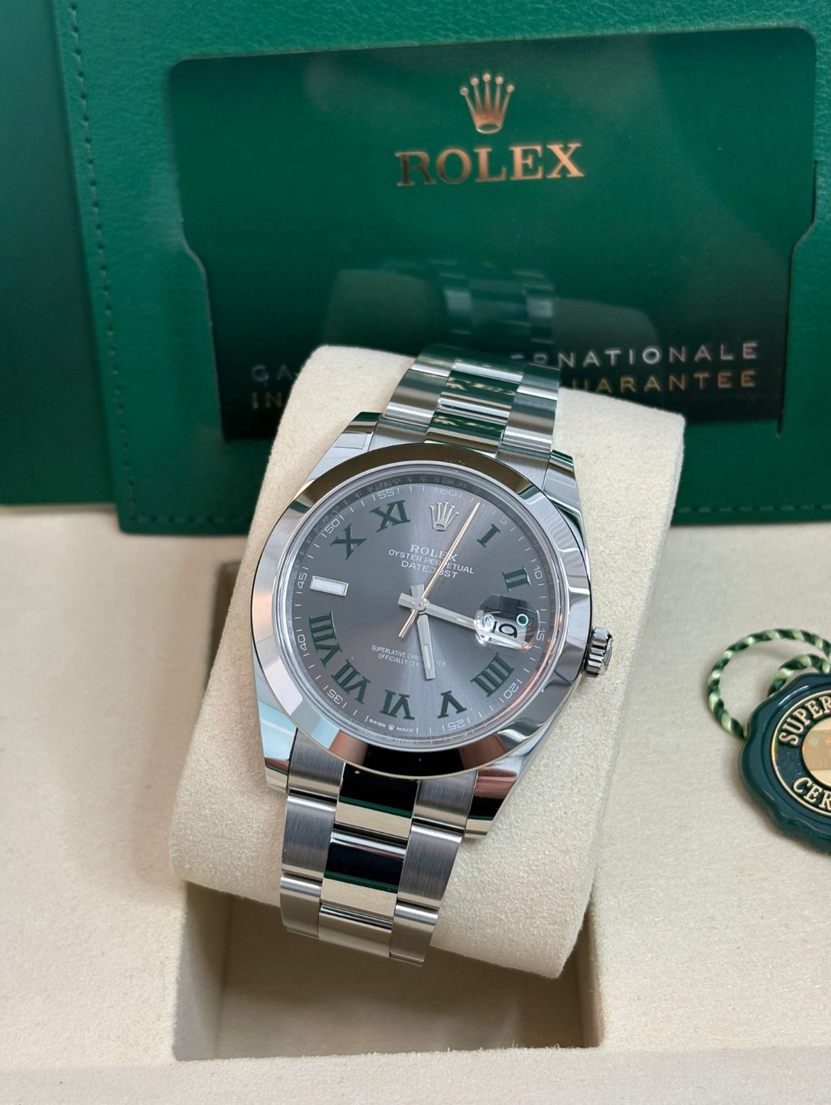 De Rolex Datejust 126300 met de gewilde Wimbledon Dial is een perfecte mix van klassiek design en moderne sportiviteit. De subtiel grijze wijzerplaat met felgroene Romeinse indexen geeft dit horloge een unieke uitstraling die direct herkenbaar is. De gladde bezel en robuuste Oyster-band maken het een ideale keuze voor dagelijks gebruik én formele gelegenheden.