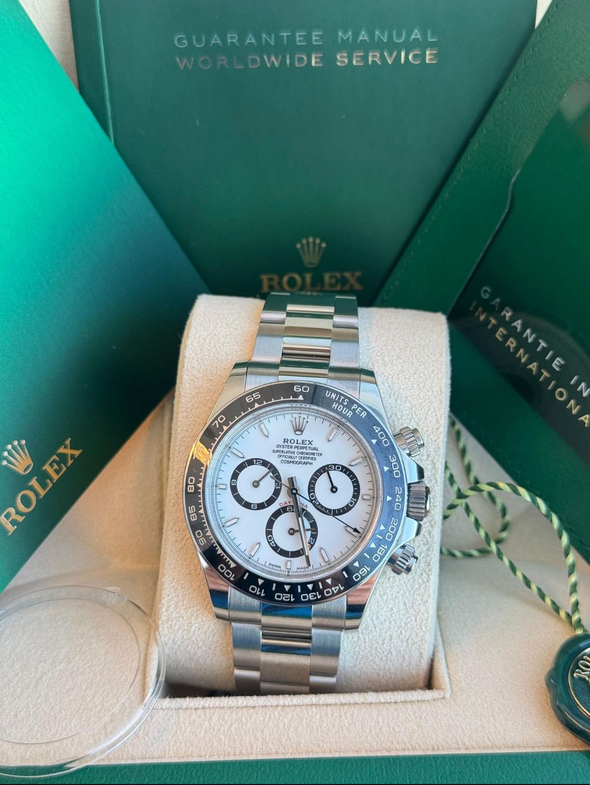 De Rolex Daytona 126500LN is hét icoon onder de chronografen. De geliefde "Panda Dial" uitvoering combineert klassieke stijl met sportieve prestaties. Met zijn robuuste 40mm Oystersteel kast, keramische bezel en de wereldwijd erkende betrouwbaarheid van het Rolex-uurwerk, is dit horloge zowel een investering als een statement piece.